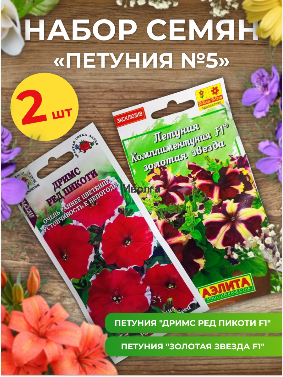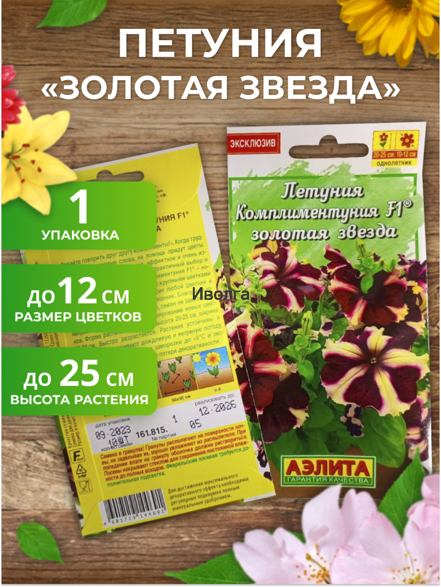 Петуния Комплиментуния "Золотая звезда F1" - эксклюзивный гибрид (новая петуния) с крупными цветками и суперобильным цветением. Украсит любой цветник и будет долго дарить радость и восхищение. Благодаря наличию гена мужской стерильности семян не завязывает, направляя всю энергию на формирование новых цветков. Форма растений кустовая, со склонностью к трейлингу: ширина больше высоты. Высота 20-25 см, ширина 25-30 см. Быстро разрастается. Растения устойчивы к болезням, выдерживают дождливую и ветреную погоду, переносят кратковременные заморозки до –5°С и экстремальную жару до +40°С без потери декоративности.