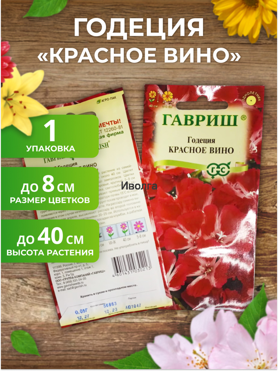 Годеция "Красное вино" смесь сортов - однолетнее декоративное растение из семейства Кипрейные высотой около 40 см. Цветет очень обильно с июля до заморозков. Цветки шарлахово-красные, махровые, крупные, 5-8 см в диаметре. Холодостойка, светолюбива, не переносит избыточного увлажнения.